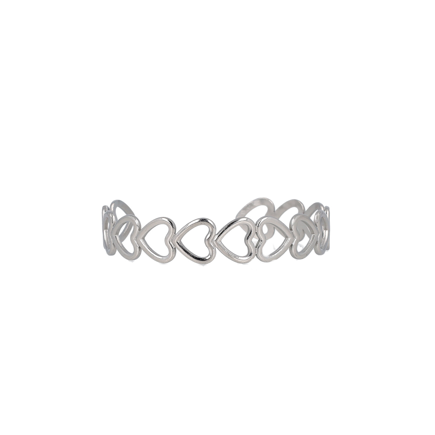 Una catena di cuori unita in un design continuo e armonioso. Romantico ma contemporaneo. Bracciale rigido con cuori concatenati in acciaio inox. Stile romantico e moderno, perfetto per ogni occasione.