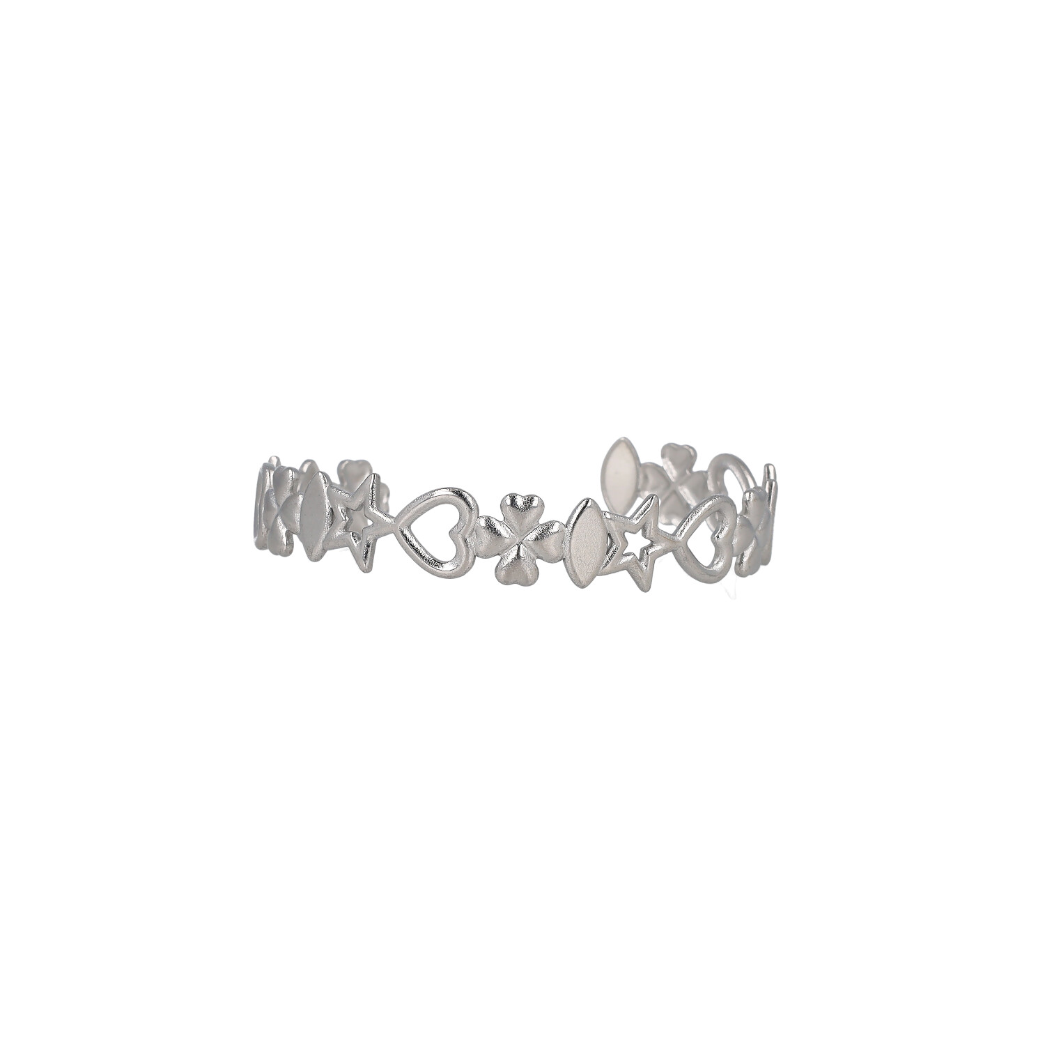 Un mix di simboli portafortuna: cuori, stelle e quadrifogli si intrecciano in un design unico e significativo.