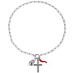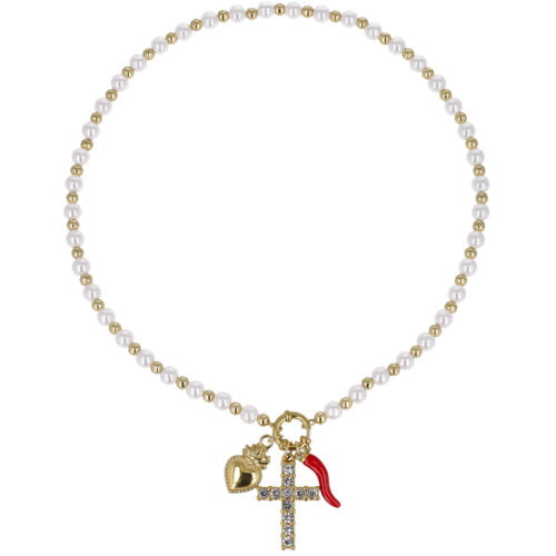 Collana girocollo in acciaio inossidabile e perline bianche lunghezza 38 centimetri con ciondoli amuleti , crocetta brillanti 2,5cm, cuore sacro da 2cm e corno rosso 2 cm