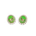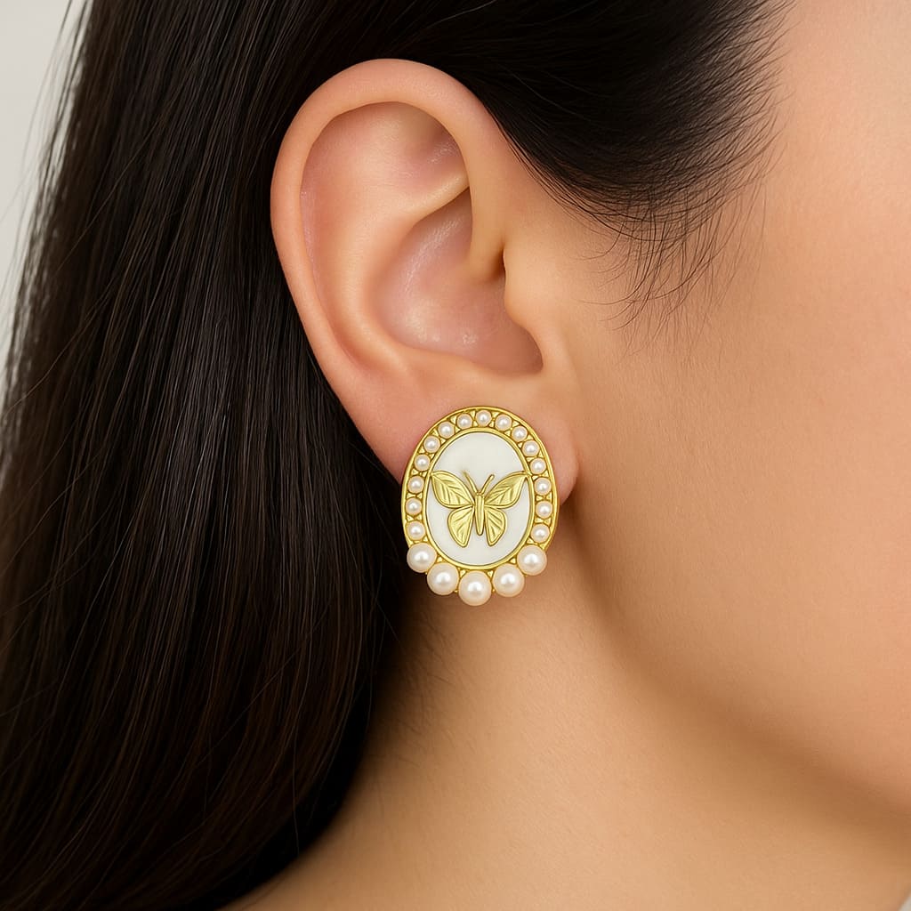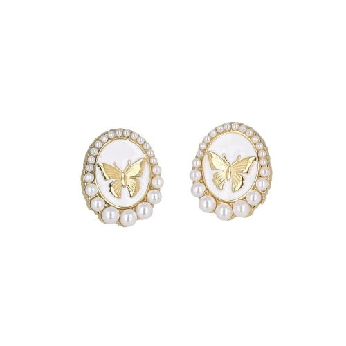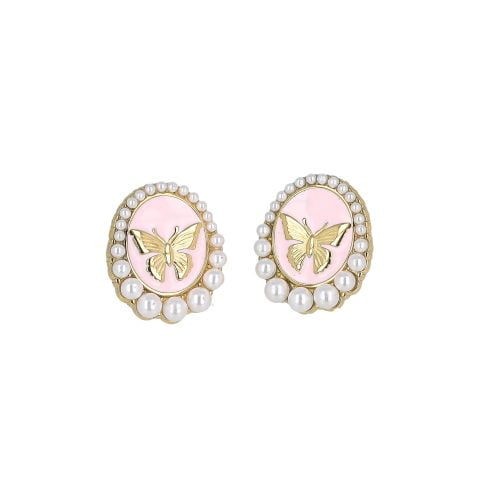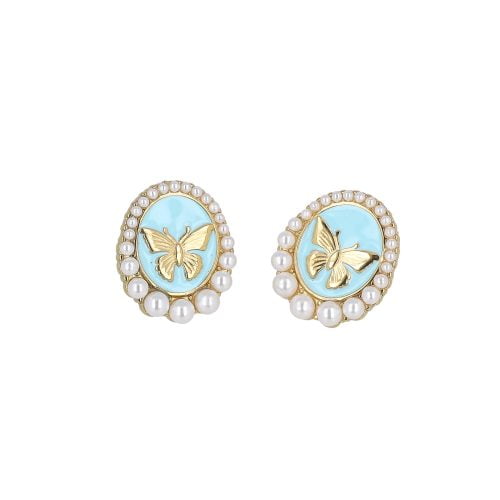 Orecchini di bigiotteria in acciaio inossidabile dipinto color oro con perno, farfalla centrale e perline con smalto colorato
